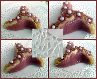 قومي بتمرير العجينتين البيضاء والبنفسجي في الالة الخاصة بالعجين في رقم 2ثم 4ثم 7 قومي بتقطيع دوائر بيضاء قطرها 9سم ودوائر بنفسجية قطرها 8 سم